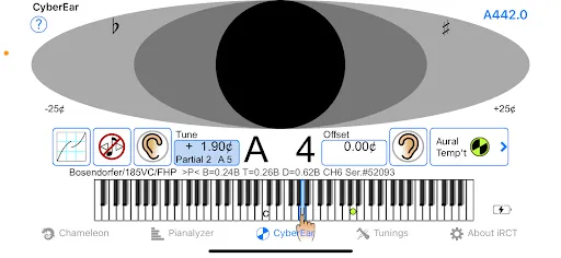 “Chameleon” is the tab in Cybertuner to use when starting a tuning, which samples the “A” notes on a piano. The tuner will choose the desired OTS (Octave Tuning Stretch) between 1-9 (1 being clean octaves to 9 being extreme octaves), sample/record the “A’s” of the piano, and continue from there.