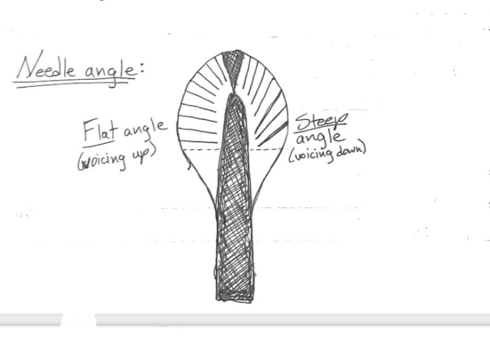 Strike Point. Only if intense extreme hardness reduction is needed. Insert needles directly on crown, in grooves (yes, actually in the groove). Two needles should just miss center. Consider this technique a last resort for softening (only if you cannot voice the shoulders further). Flatten strike point with handle butt after needling to compact fuzz on grooves.
